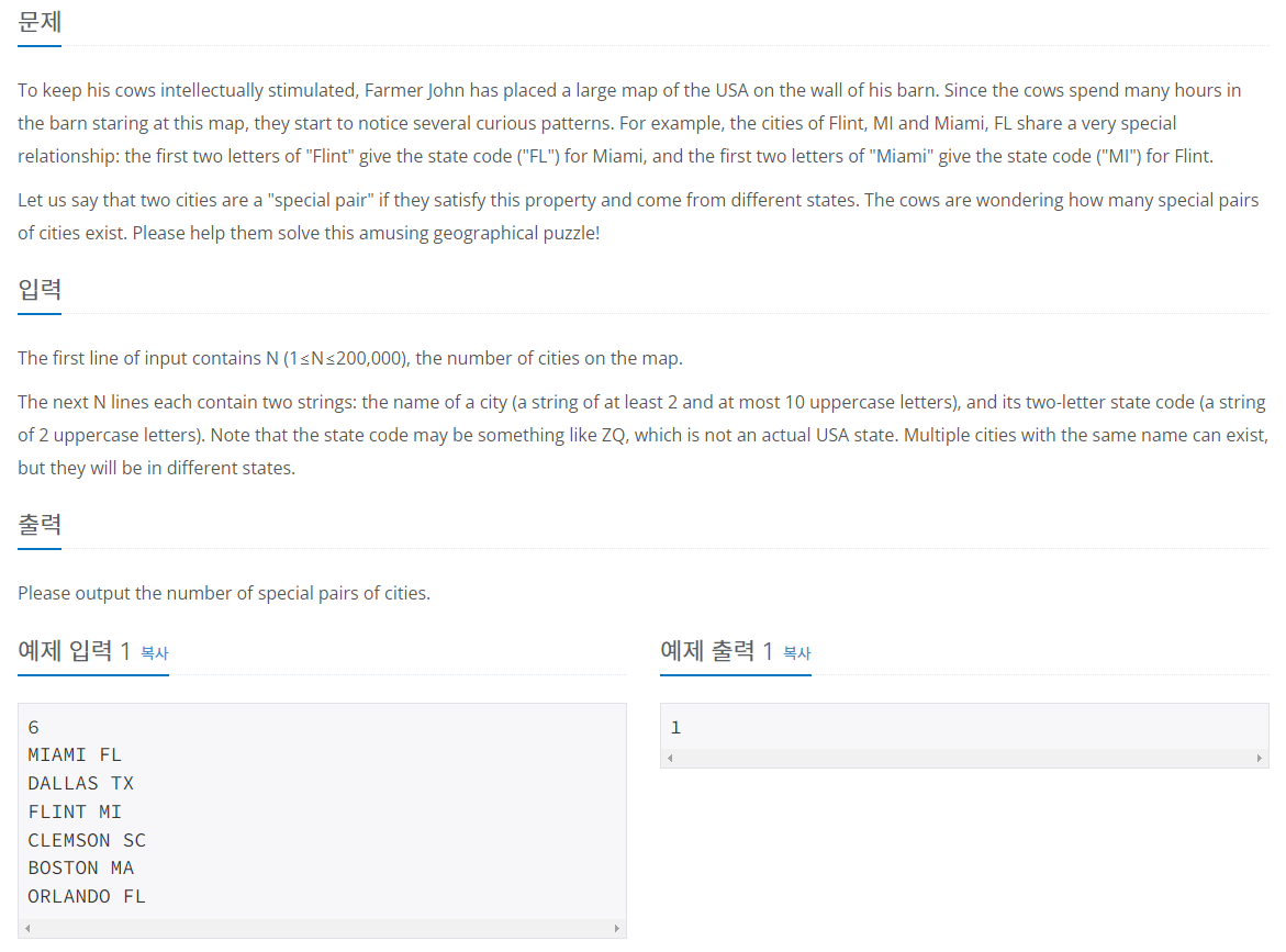 따라서 도시와 주 코드를 해싱한 뒤 체크할 때 도시의 앞 2글자와 주 코드가 같은 경우는 빼고 체크하면 된다.