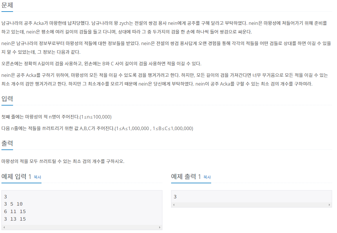 왼손에 들어야 하는 검의 길이는 [B,C] 형태의 구간을 띄기 때문에, 모든 적의 [A, B, C]를 B 기준으로 오름차순 정렬한 뒤 C 기준으로 내림차순 정렬했다.